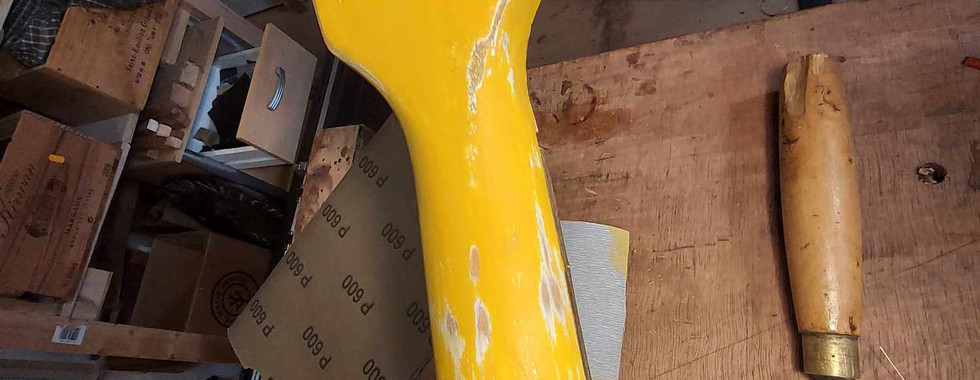 After this I sanded the splints/neck smooth (and filled any gaps). I then started the grueling process of refinishing the neck, I don't have spray equipment so having to finish with brushes, a lot of sanding and patience is required. Start with a white undercoat, and then proceeded to match the yellow colour. This took a lot of back and forth until I was happy with the colour match and the feel of the finish. I then proceeded to scratch it up and match it into the road worn distressed look of the finish of the guitar.